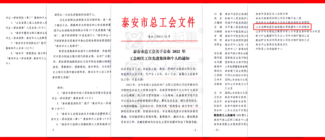 近日泰安市總工會公布了2022年度工會 相關工作先進集體和個人的公告 榜樣領航 奮勇爭先 龍輝起重小車裝配班光榮上榜 龍輝起重認真貫徹落實泰安總工會精神及重要決策部署,聚焦主責主業,強化責任擔當,積極開展“登高望遠 奮力爭先”創新創優勞動競賽,切實做好職工思想引領、素質提升等各項工作。 龍輝起重小車裝配班是一支團結拼搏、開拓進取、敢打硬仗的團隊。自組建以來,主要負責起重機生產制造、售后服務等。秉承“創一流攻堅鐵軍”的理念,以精細化管理規范,以標準化作業要求,攻堅克難。 生產制造的“上旋轉能量回饋智能鐵路集裝箱專用起重機”廣泛應用于鐵路轉運貨場,安全穩定,作業效率高,替代同類進口產品,榮獲新泰市科技進步二等獎,入選2022年度山東省首臺(套)技術裝備產品。 制造的“QZ智能生活垃圾專用起重機”在裝卸過程中,能夠實現“物料識別、三維掃描、信息交互“等功能,廣泛應用于垃圾焚燒發電廠等環保產業,深受客戶好評,入選第六批山東省制造業單項冠軍名單。 為上海電氣定制500+200噸輕量化超大型起重機,創造了新泰市起重園區近16年來的單機記錄,是市政府大力推動起重產業集群建設發展史上的一個里程碑。 弘揚勞動精神,激發奮進合力。龍輝起重聚全員之心,激發建功熱情,充分發揮了橋梁和紐帶作用,為持續推動公司高質量發展做出積極貢獻。 |